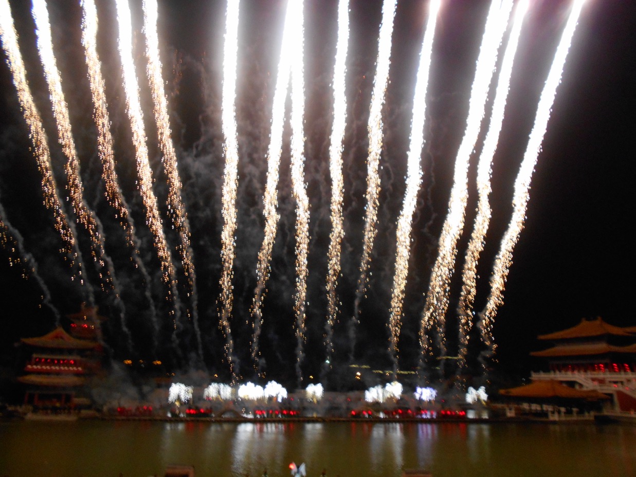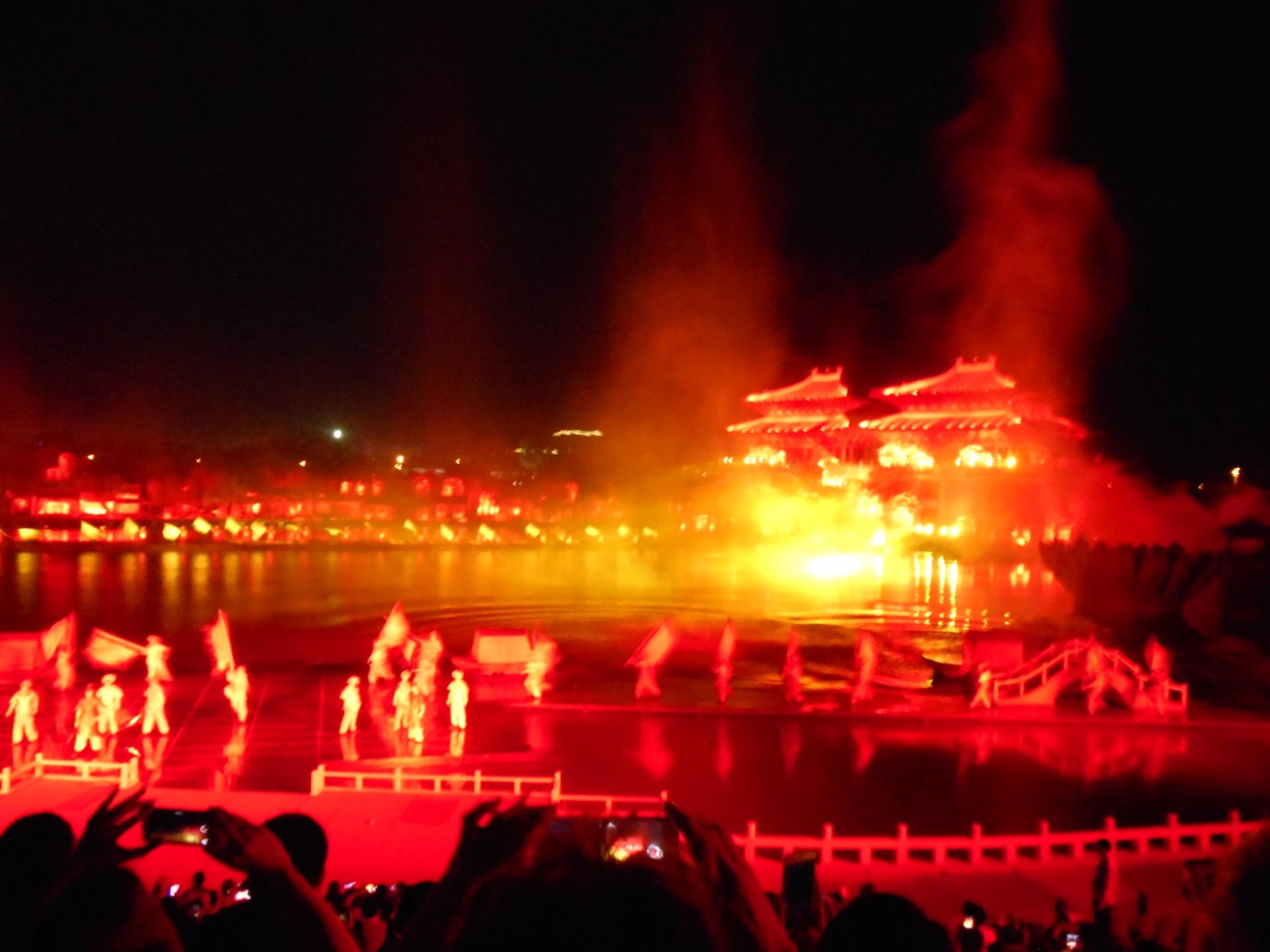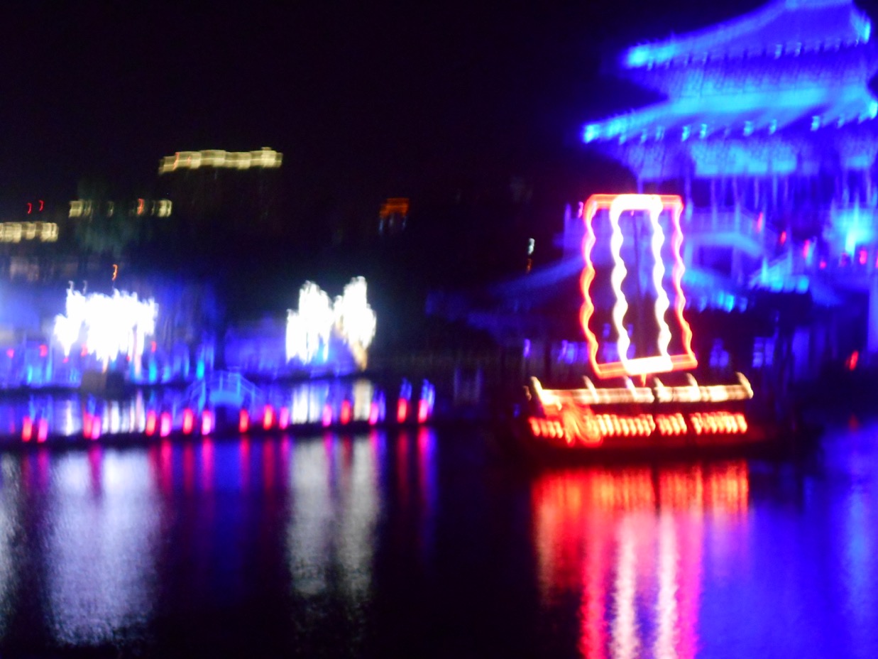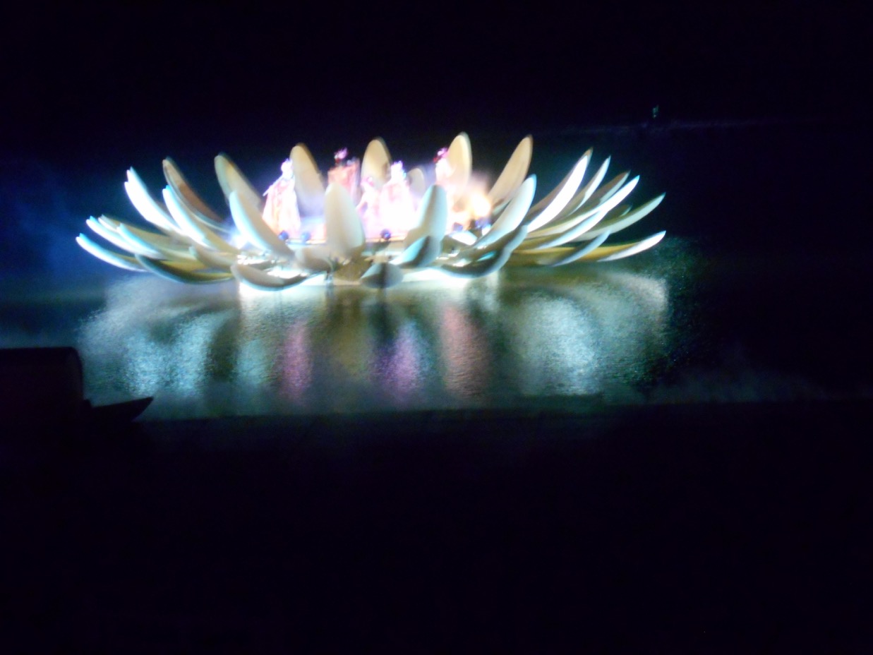 In the evening, when it gets dark, the water show (tickets are so very difficult to obtain) on the lake is created with high tech and audio and visual effects. After a welcome dinner hosted by Kaifeng Municipal Tourism Committee, this was one of the finest performances on the itinerary’s ‘menu’. “Dreamlike Glory of the Song Dynasty” took place against a backdrop of mountains. From the start when a a large red lotus flower opened to display several actors, it just went to grander scenes. Even Las Vegas can’t compare. It is a Chinese version of Le Cirque du Soliel on water, bridges ( Le Cirque’s, Eau?), castles, singing, lovely costumes, all with various coloured lighting, brilliant costumes, wonderful voices and yes,the mountain back drop. Splendid